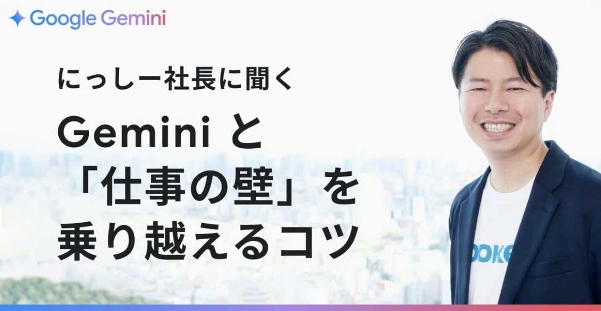 「新入社員必見! にっしー社長に聞く、Gemini と「仕事の壁」を乗り越えるコツとは?」と題された本記事では、日頃よりYouTube等でGeminiの活用法を発信する西原が、自身のコンサルタントや経営者としての経験を基に、新入社員が直面する「仕事の壁」をGeminiと共に乗り越えるための具体的なノウハウを解説しています。