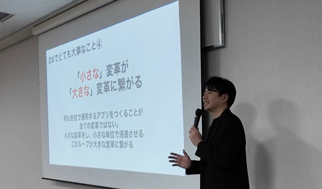 講演では、Google Workspaceを活用した「コストを抑えたDX」を実演。ITに不慣れなシニア世代のスタッフでも、スマートフォン一台で業務を完結できる仕組みを公開しました。わずか数分で営業日報システムを構築するデモンストレーションには、会場から大きな驚きとともに、「自社でも取り組める」という前向きな期待の声が上がりました。
